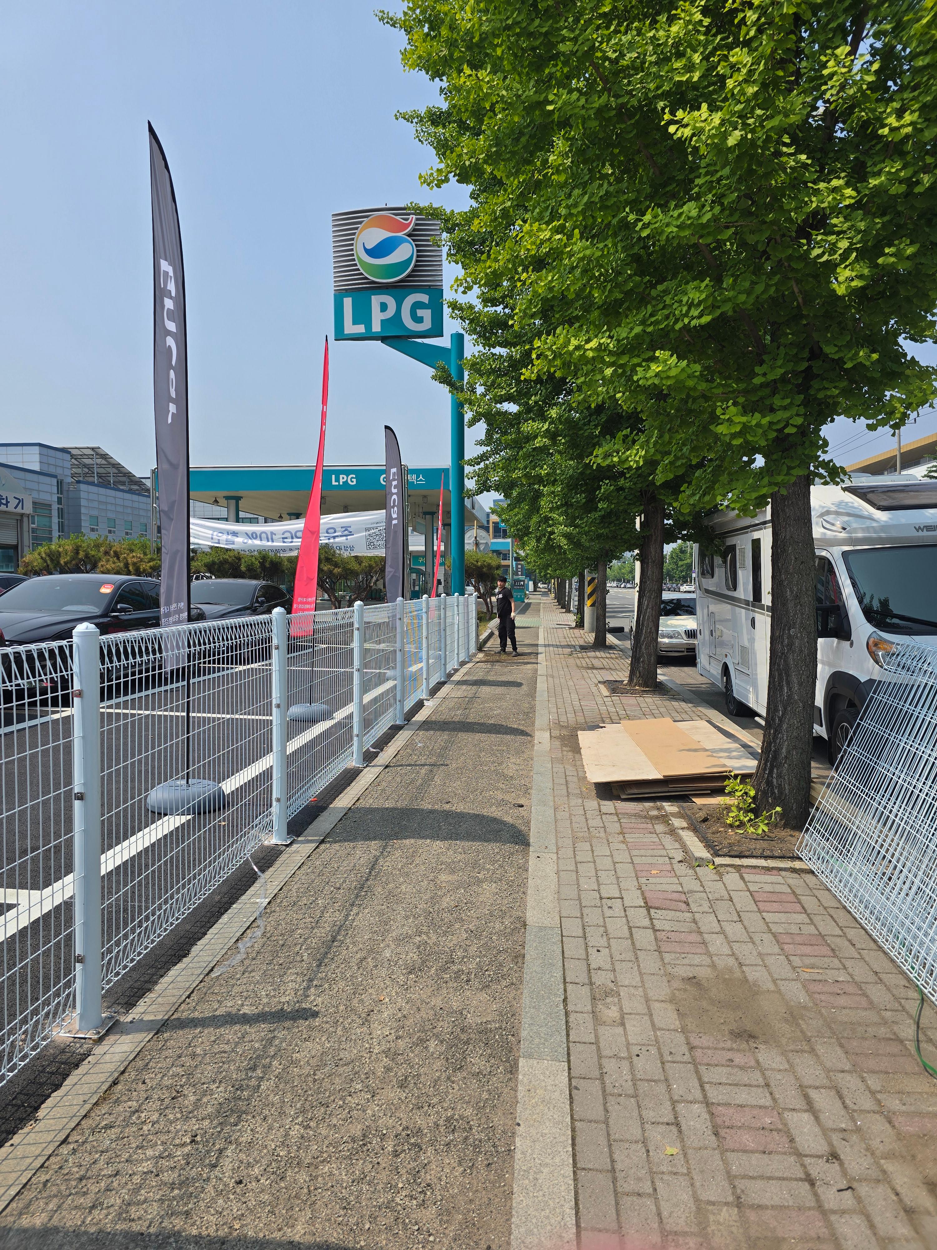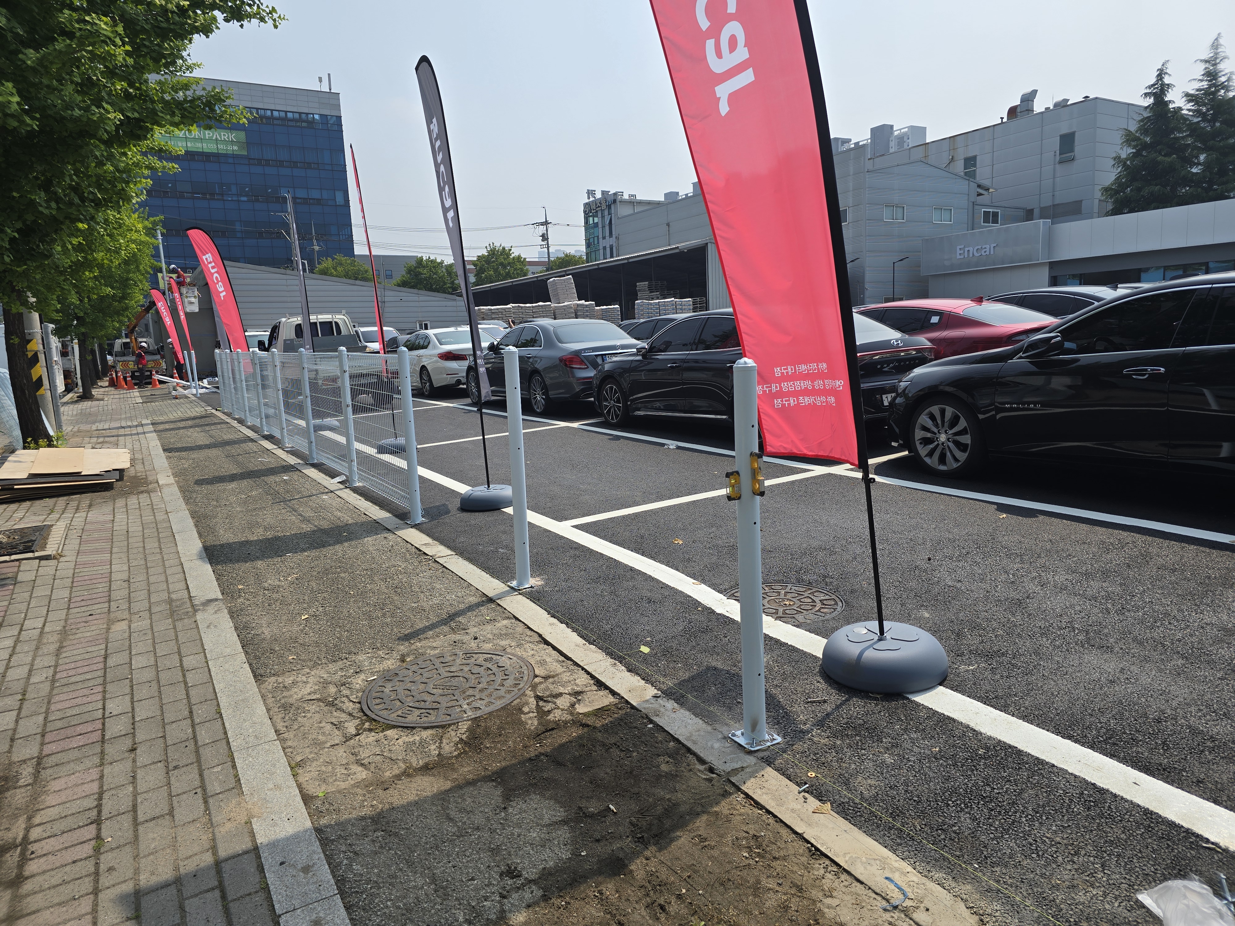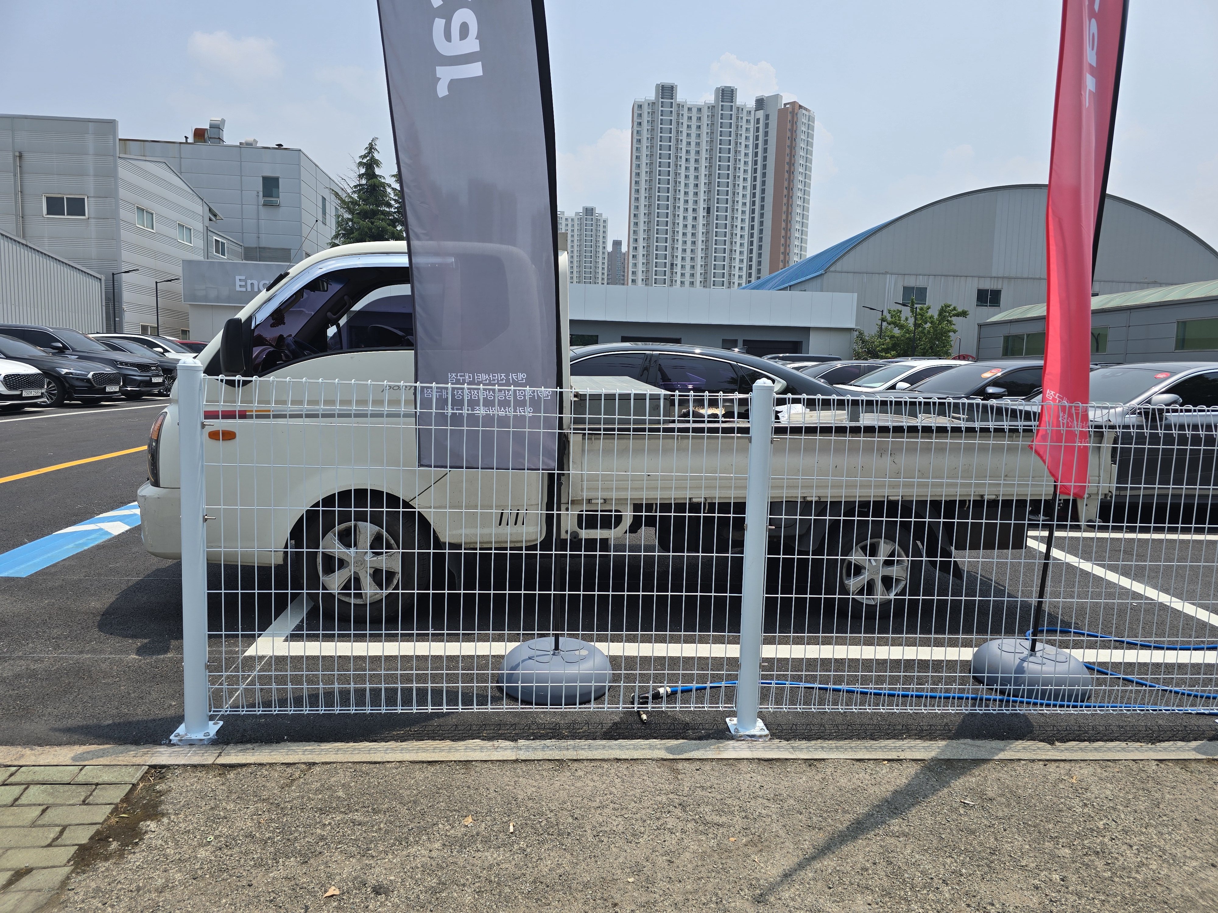 아스팔트 바닥에 흰색 메쉬휀스 시공한 현장 소개