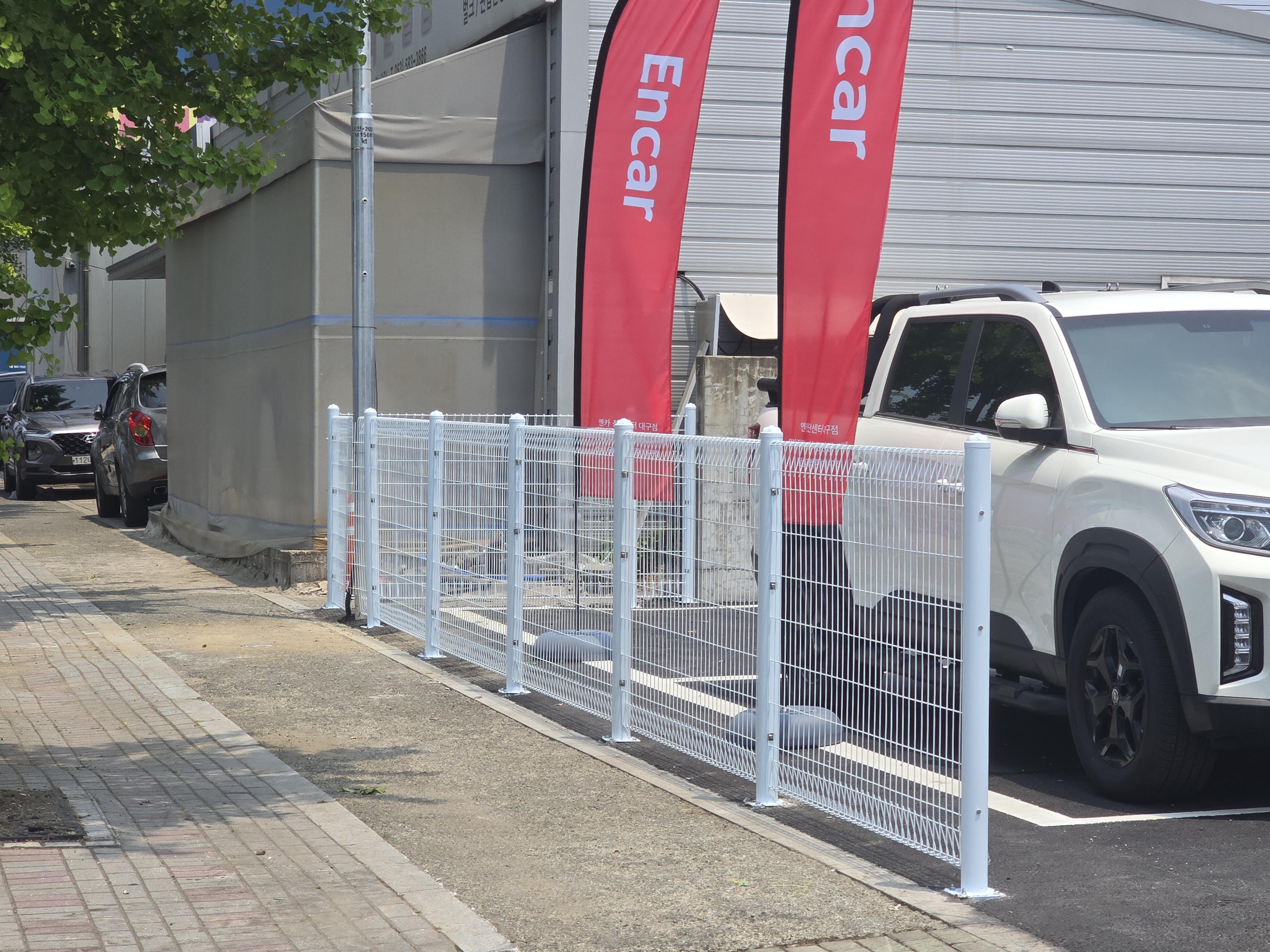 제품 색상은 **화이트(백색)**으로, 주변 환경과 잘 어우러지며 깨끗하고 단정한 인상을 주는 선택이었습니다. 메쉬휀스는 연두색, 회색, 블랙, 갈색 등 다양한 색상으로 제작 가능하지만, 흰색은 특히 공공시설이나 교육시설, 생활시설에 많이 선호됩니다.