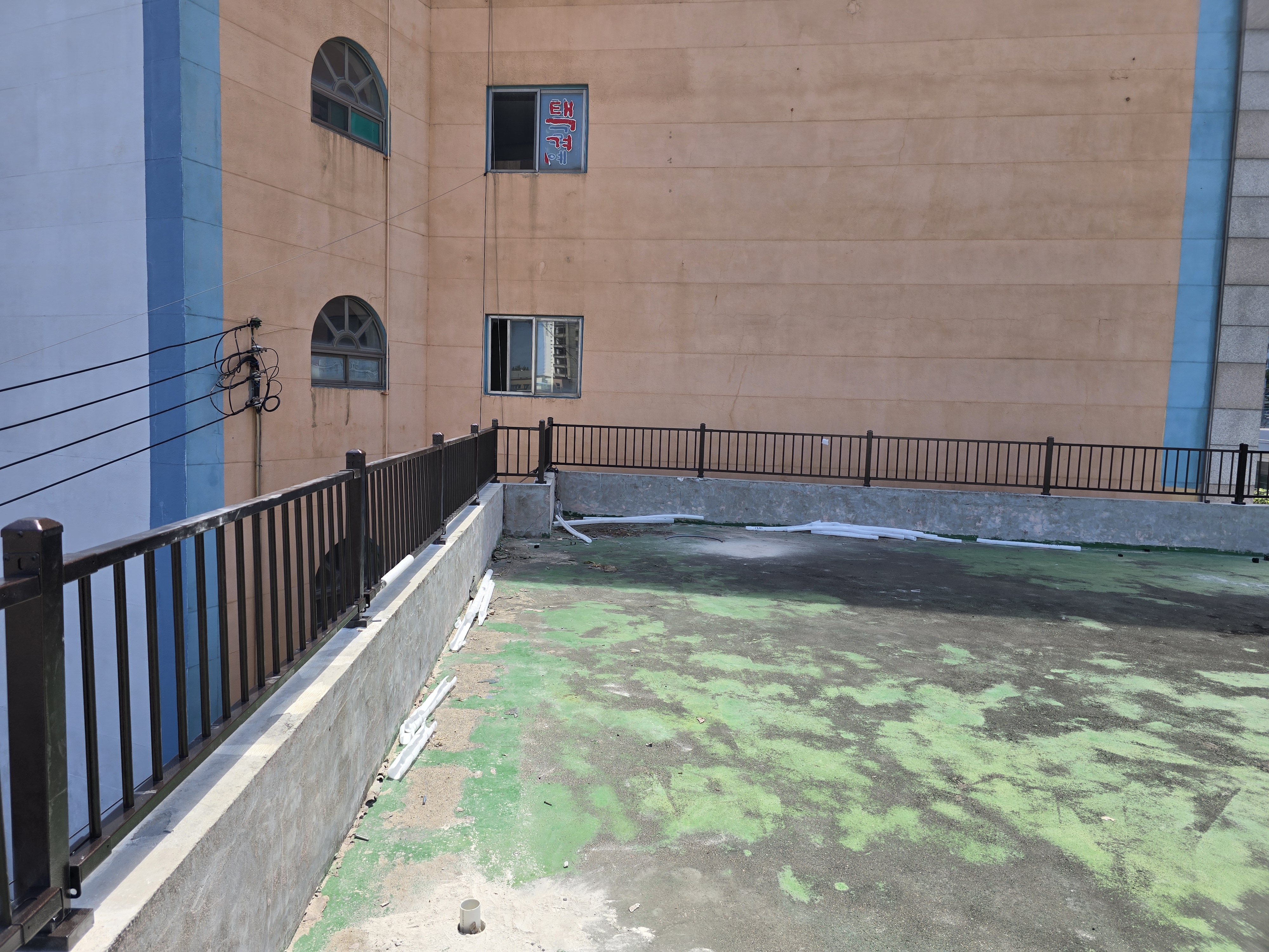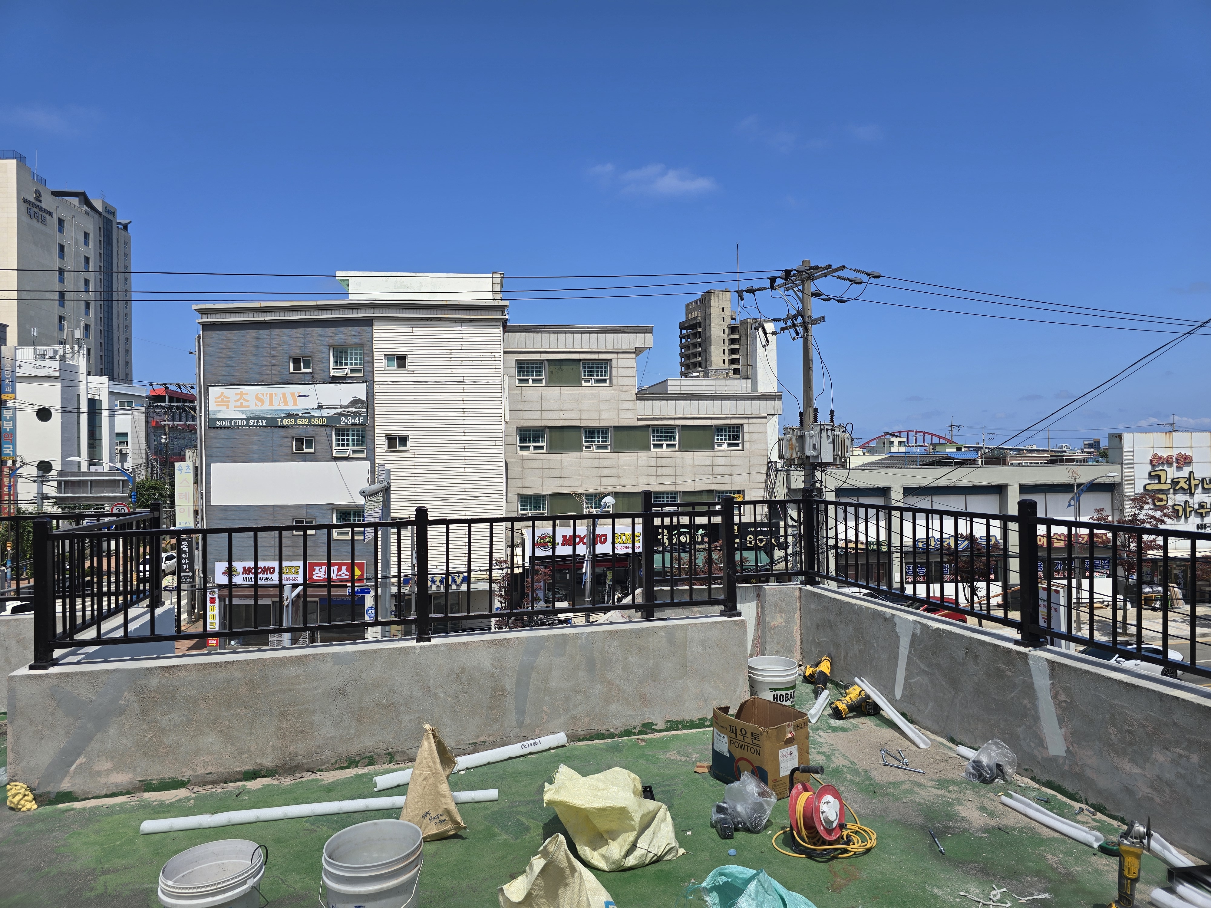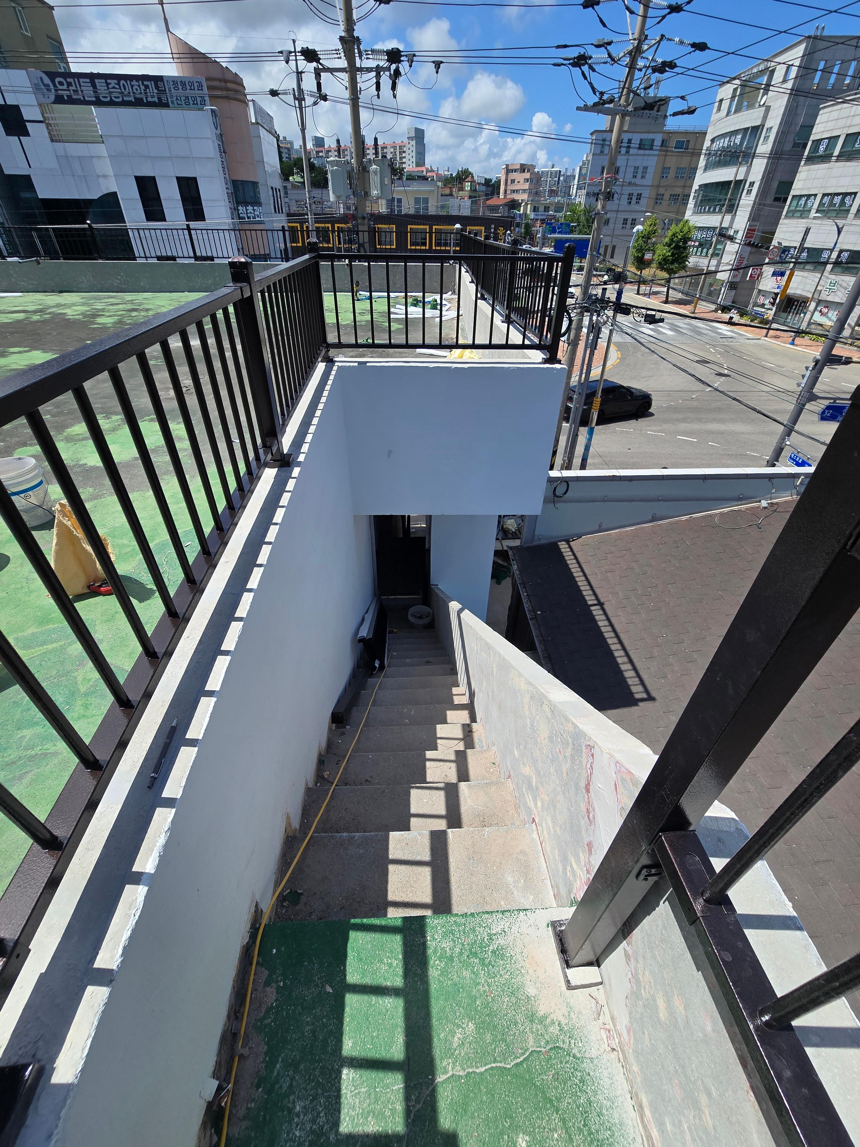 강원도 속초에 위치한 한 상가 건물에서 옥상 난간대, 계단 안전 구조물, 2층 테라스 방호 시설을 새롭게 설치한 사례입니다.