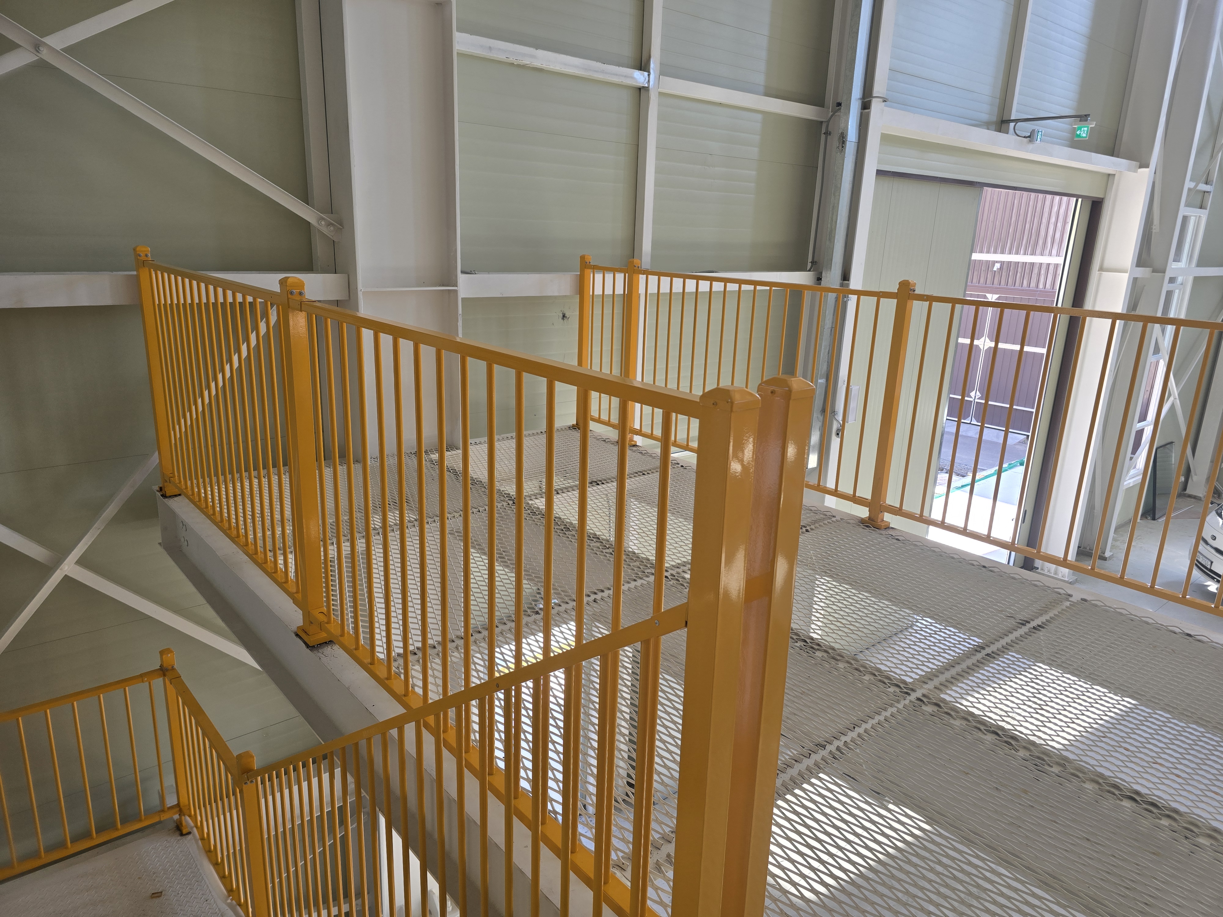 공장 내부에는 층간 이동을 위한 계단 구간도 포함되어 있었는데, 이 구간 역시 동일한 재질과 색상의 (안전난간, 핸드레일, 외부 난간) 을 설치했습니다. 계단 난간은 사용자의 손이 직접 닿는 부분이기 때문에 안정적인 지지력과 매끄러운 마감이 중요합니다. 동일한 소재와 색상으로 제작함으로써 공장 전체 공간의 디자인 일체감과 안전성을 동시에 확보할 수 있었으며, 시각적으로도 깔끔하고 완성도 높은 마감 효과를 얻을 수 있었습니다.