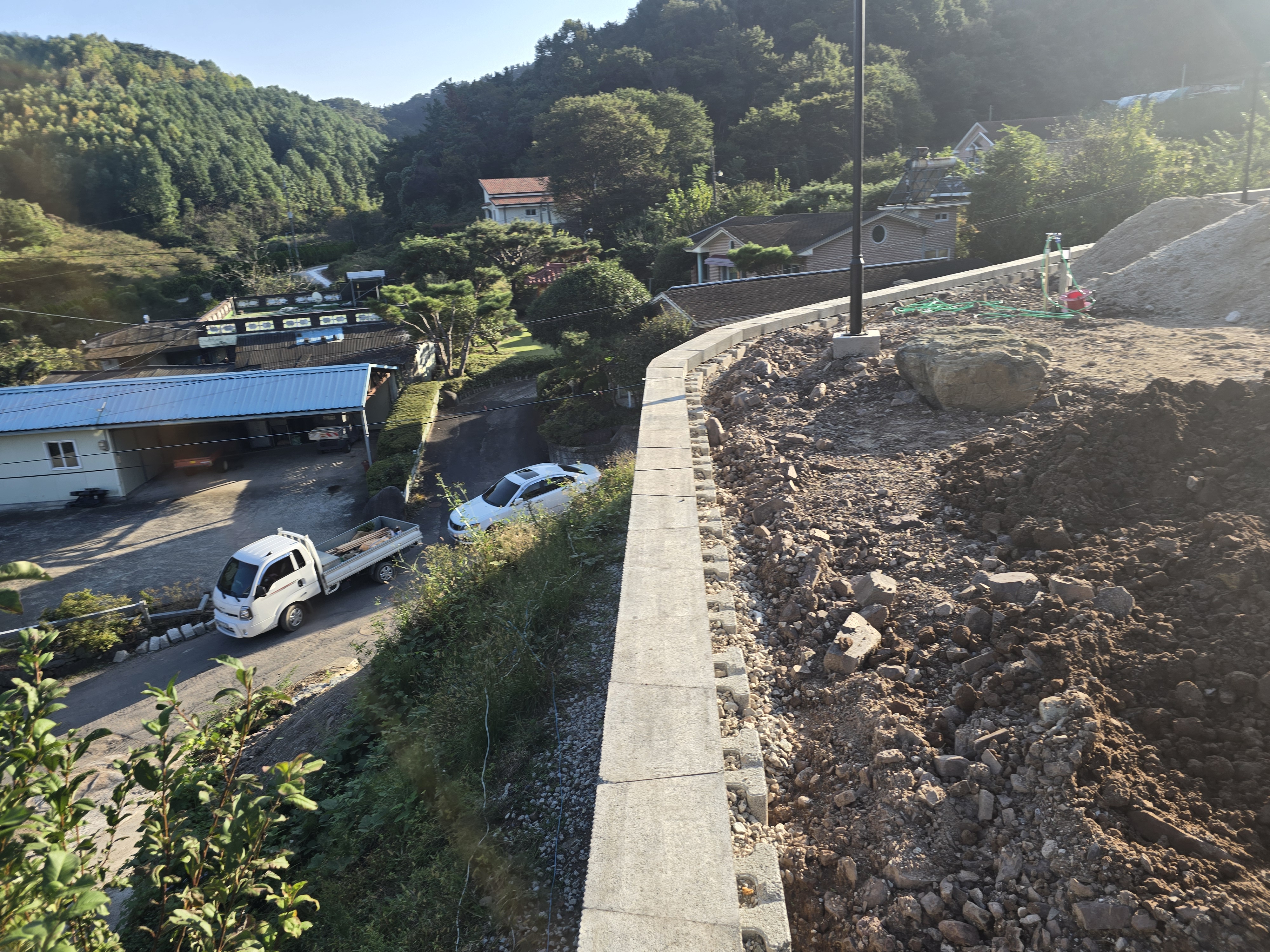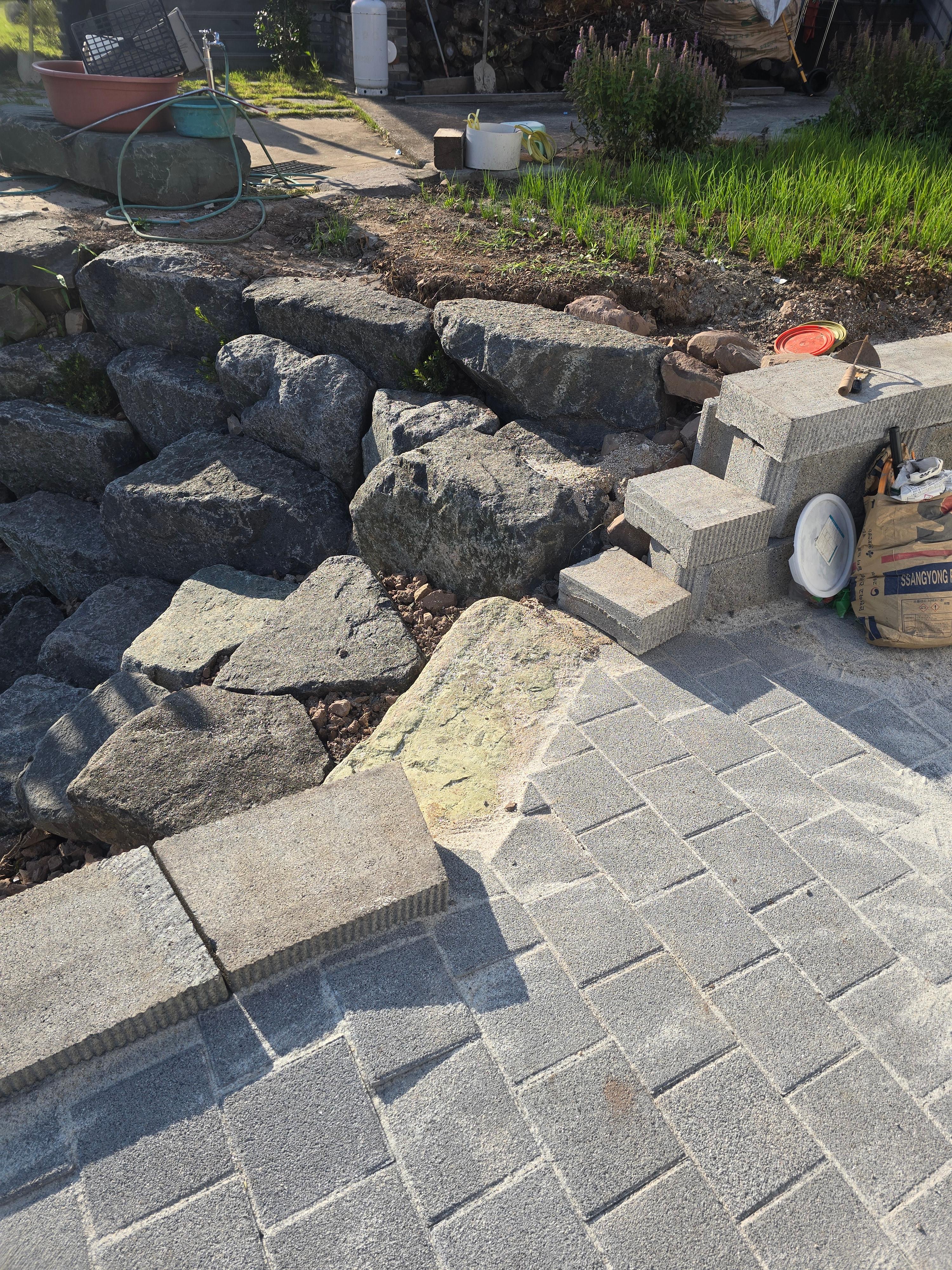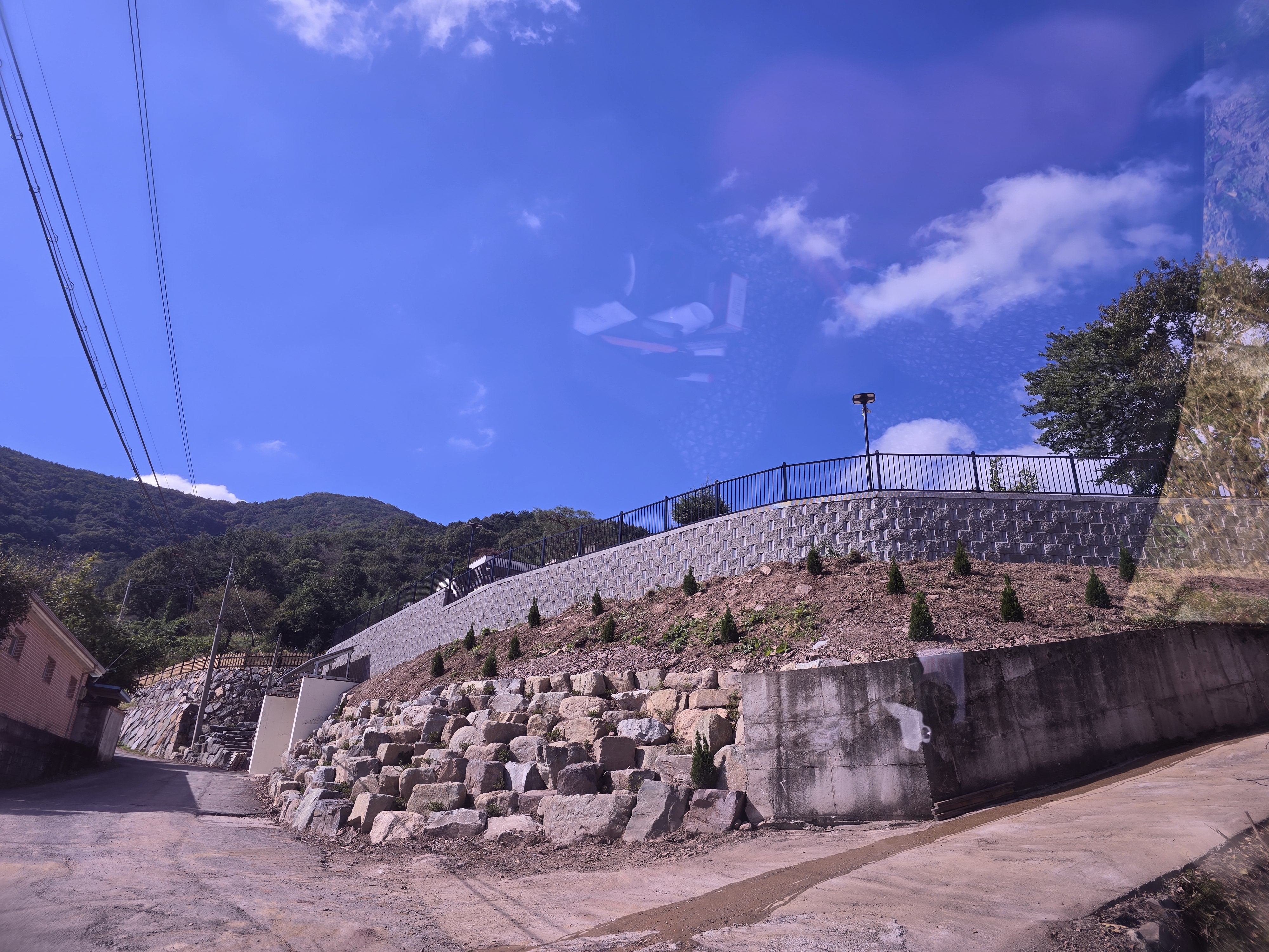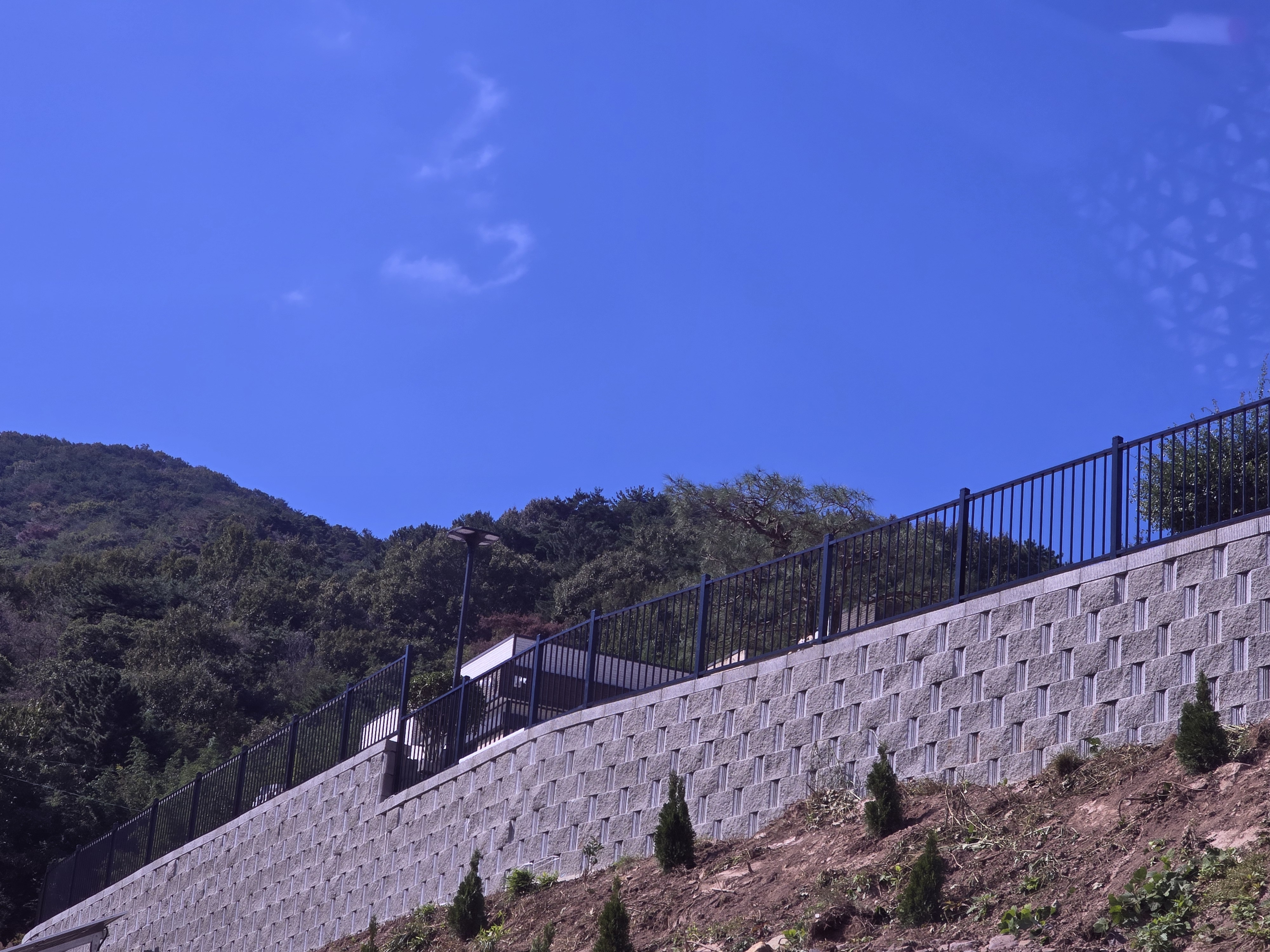 보강토 상부는 콘크리트가 아닌 흙마감 위에 블록으로 마감되어 있어, 포스트(기둥) 고정 시 구조적인 안정성을 확보하기 위해 앙카 작업과 몰탈 보강을 병행했습니다.
