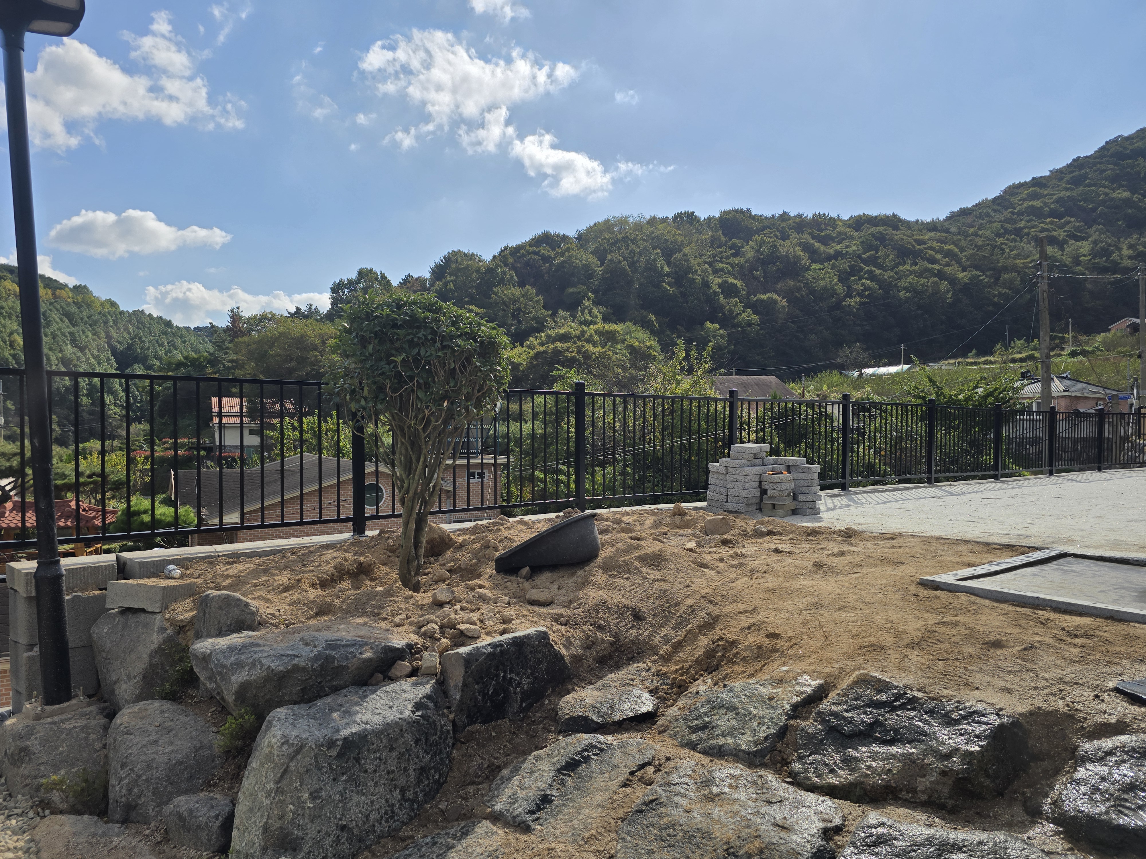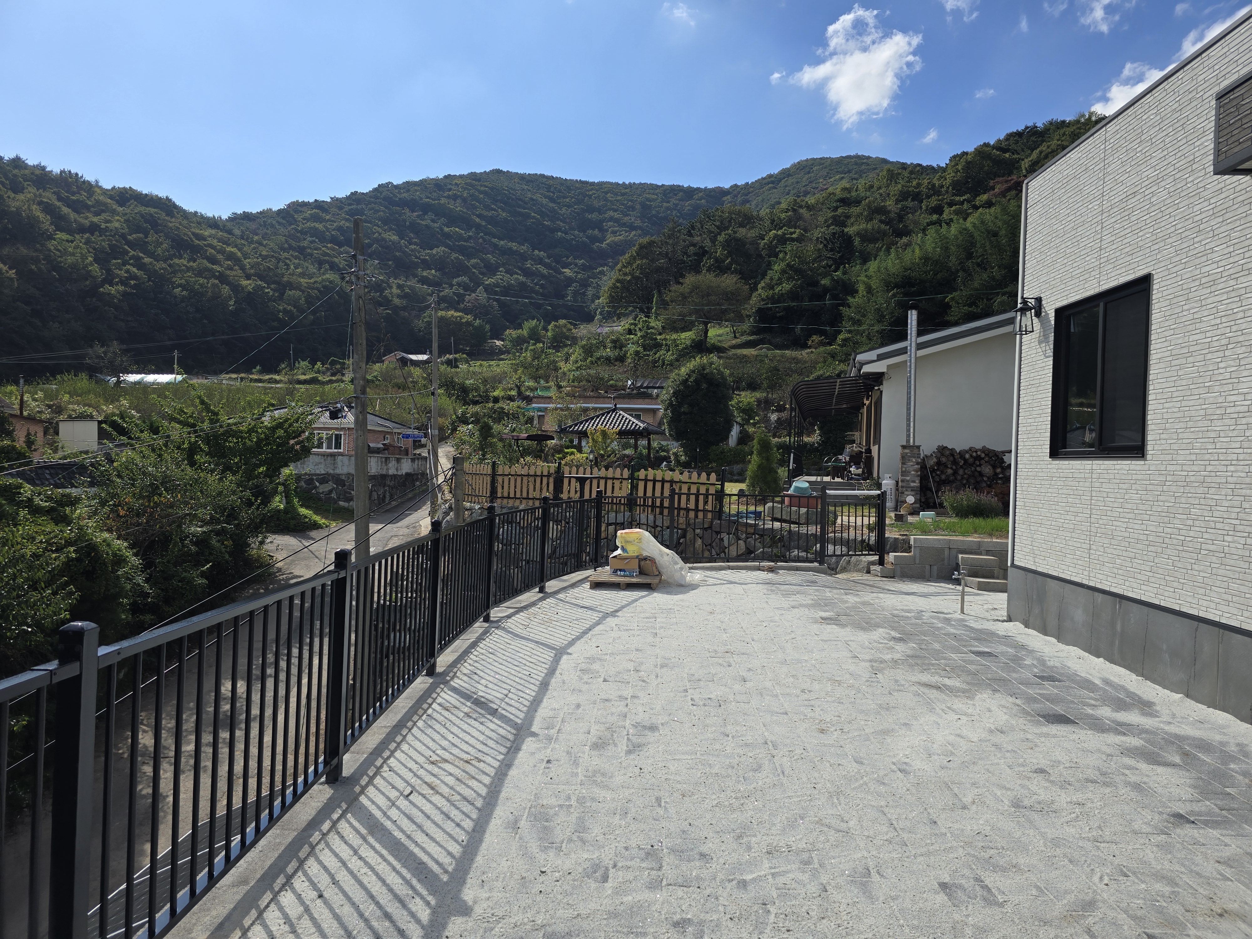 보강토 경계가 선명하게 구분되면서 공간의 경계감이 확실해졌고, 블랙 색상의 디자인 난간대가 주변 조경과 어우러져 전원주택의 품격을 높였습니다.