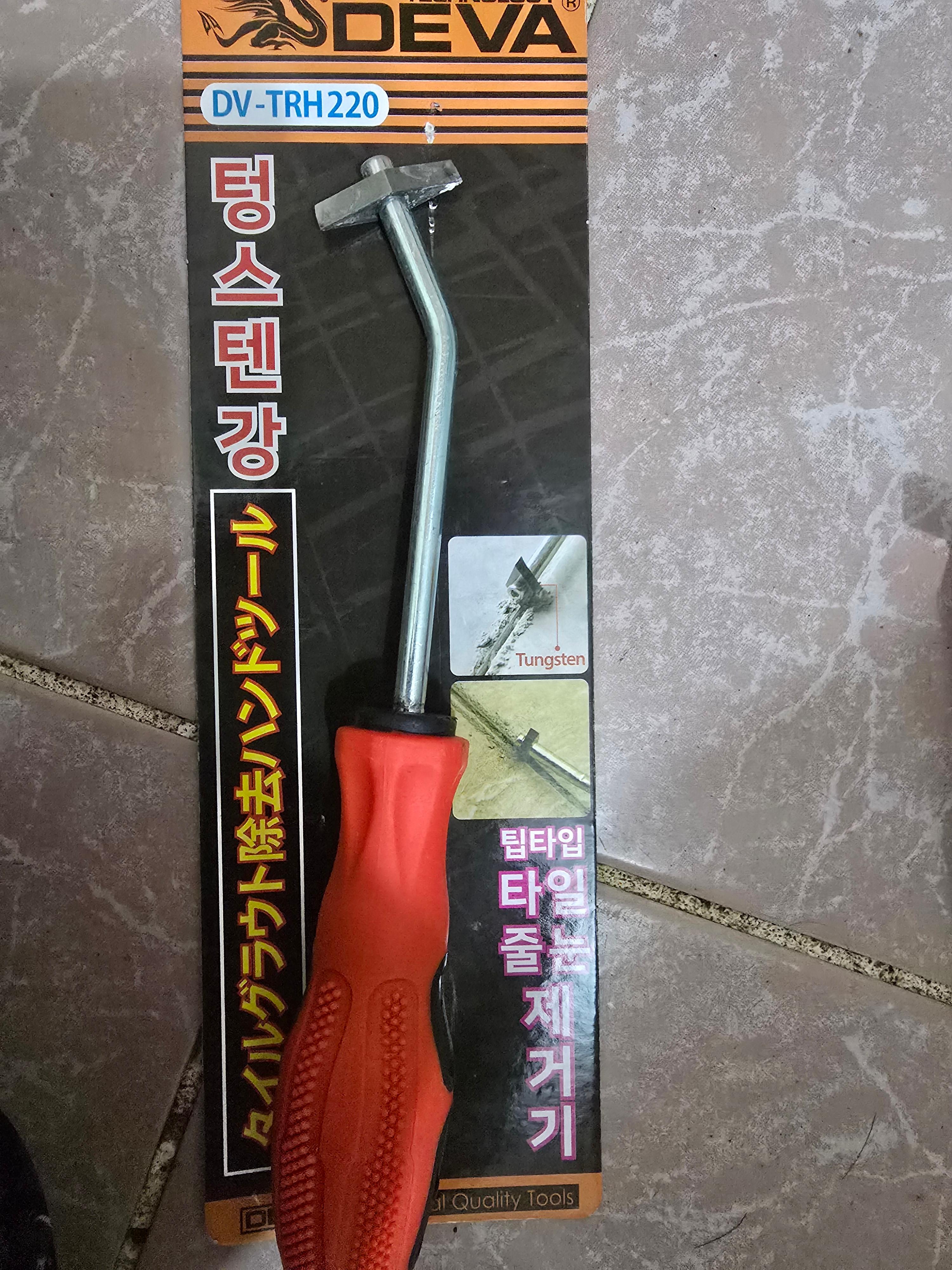 타일 틈새에 있던 백시멘트 줄눈이 군데군데 깨지고 변색되어 있어 먼저 스크래퍼를 이용해 모두 긁어냈습니다.