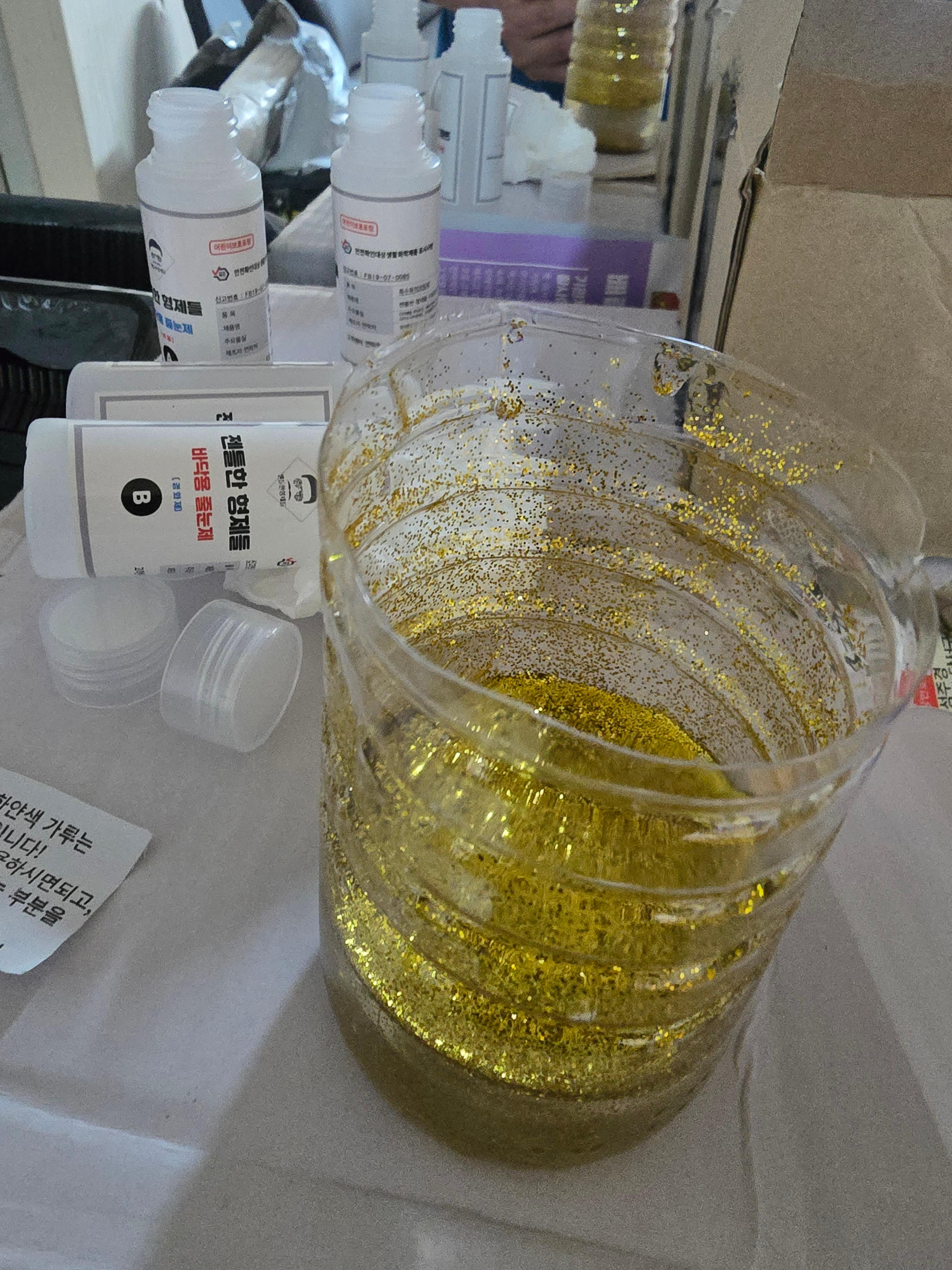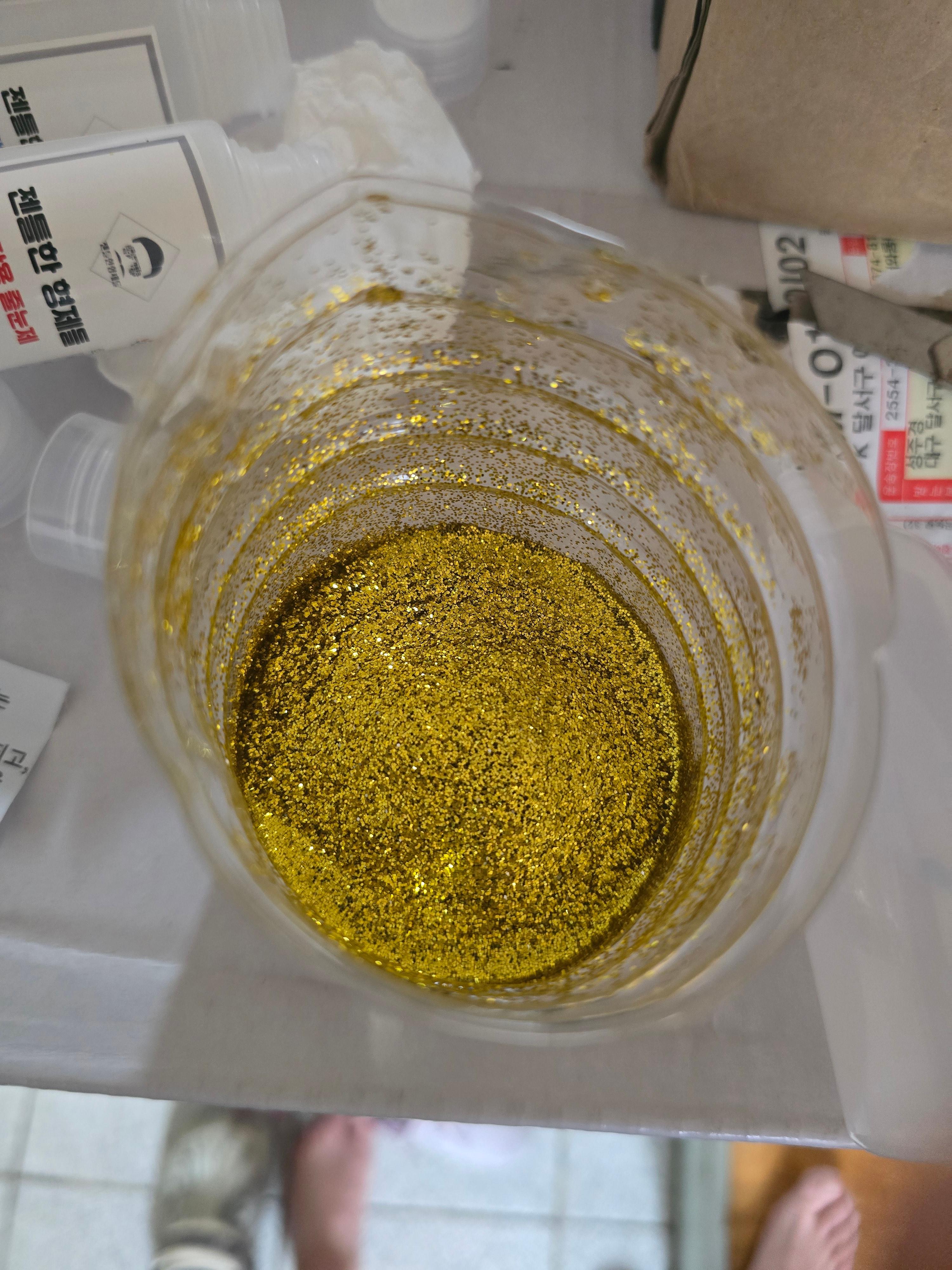 처음엔 반짝이는 펄 입자가 바닥에 가라앉아 있었는데, 계속 섞다 보면 점점 균일하게 섞이며 금빛이 살아납니다.