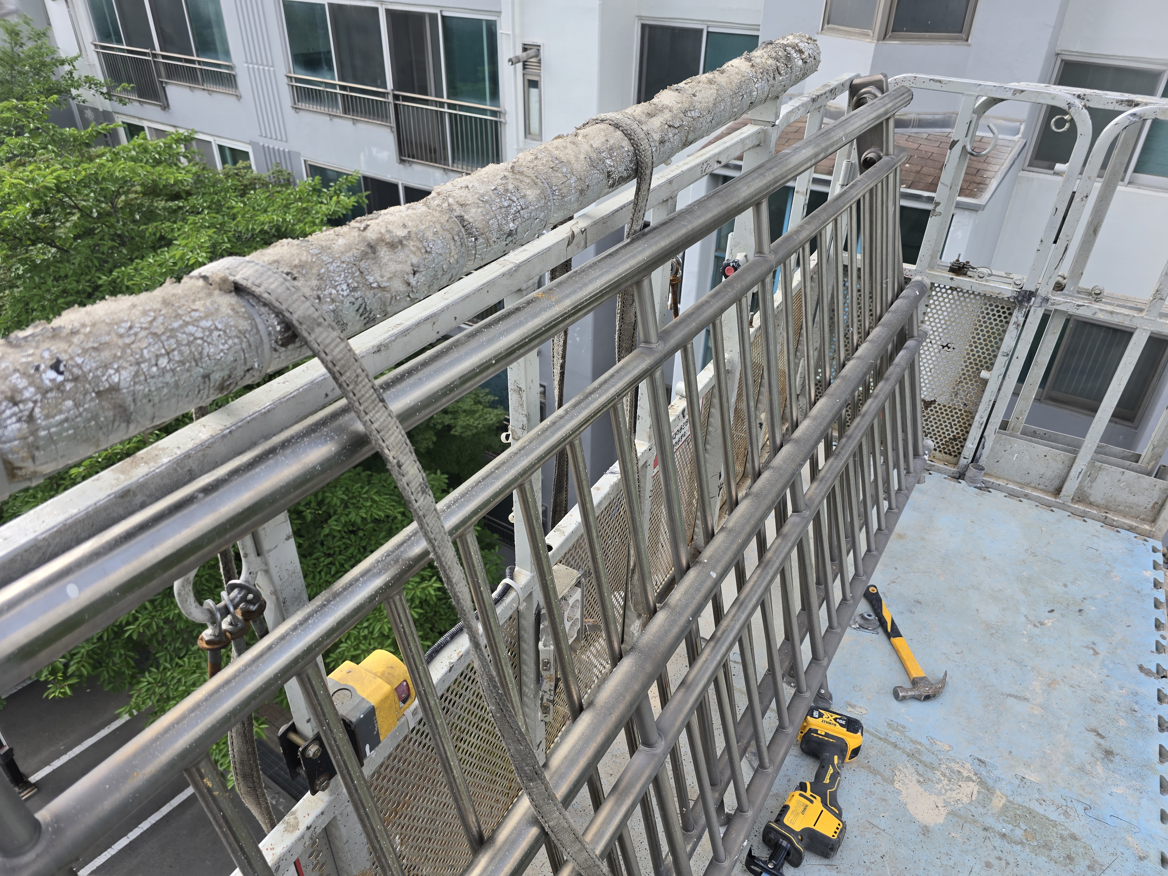 고층 외벽에서 진행되는 작업이기 때문에 스카이 장비를 투입하여 안전하게 시공을 진행했습니다.