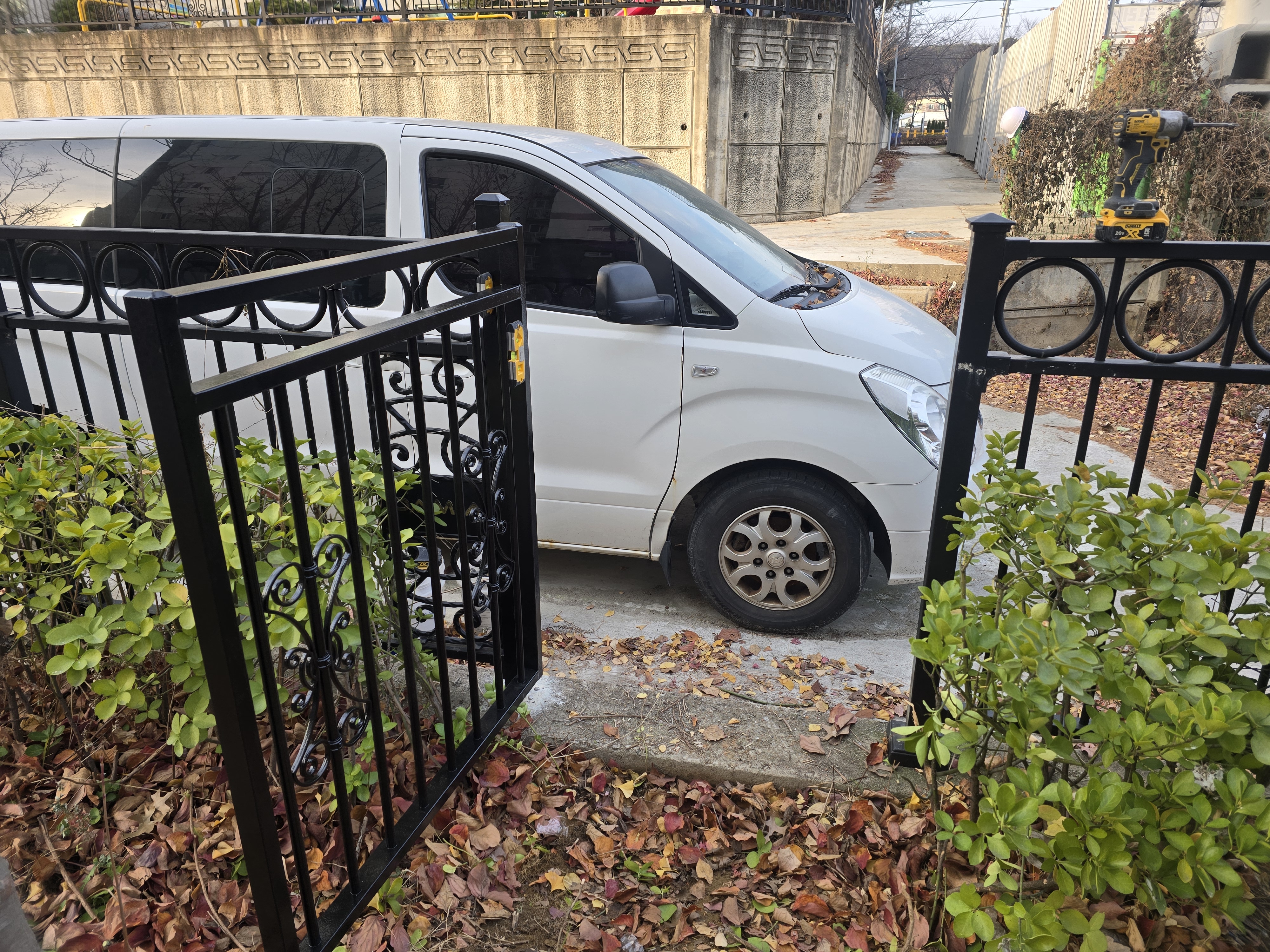이번 쪽문은 기존 (안전난간대) 라인과 자연스럽게 어우러지는 것이 중요했어요. 기본적인 프레임 구조를 적용하되, 요청에 따라 단조로운 느낌을 피하기 위해 디자인 요소가 들어간 형태로 제작했습니다. 지나치게 화려하지 않으면서도 일반 막힘 구조와는 분명히 다른 인상을 주는 디자인이에요.