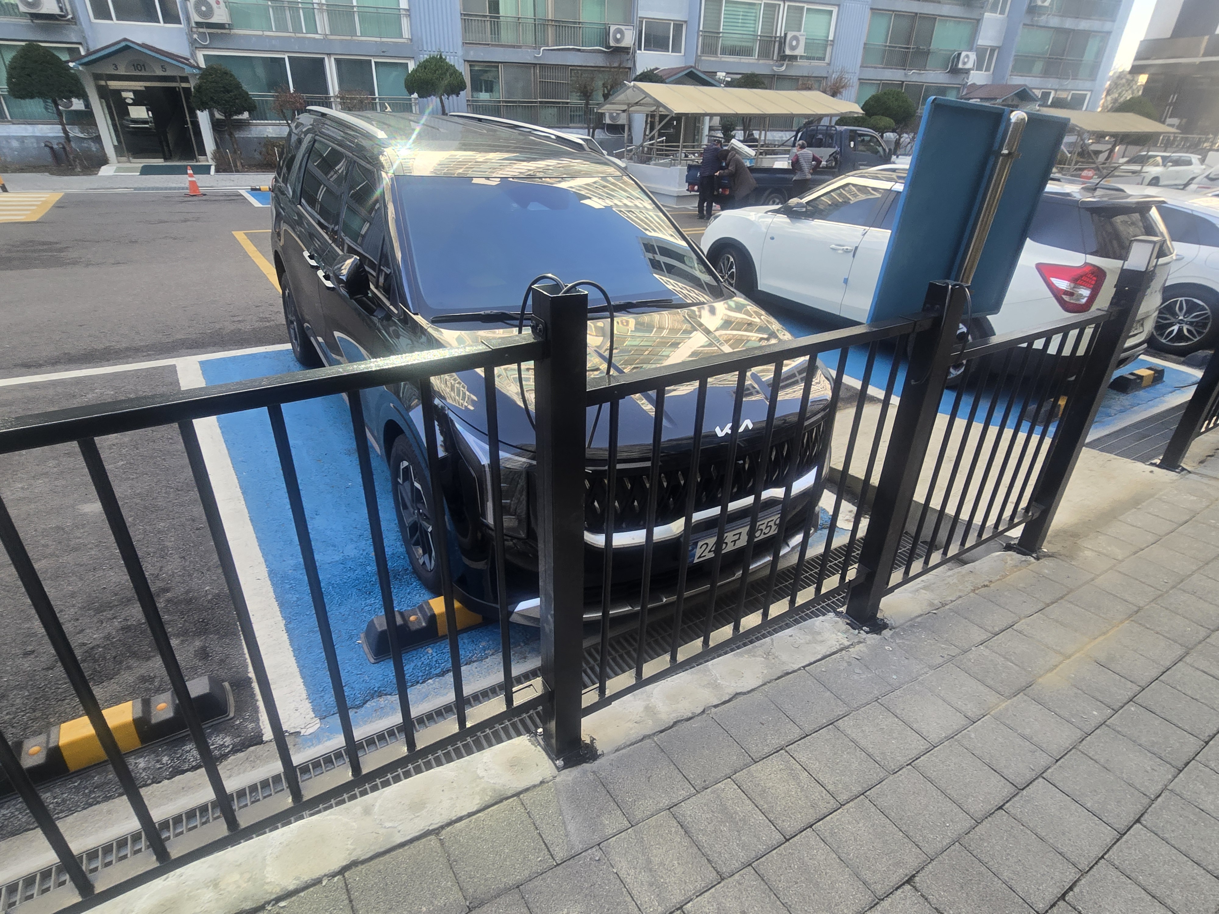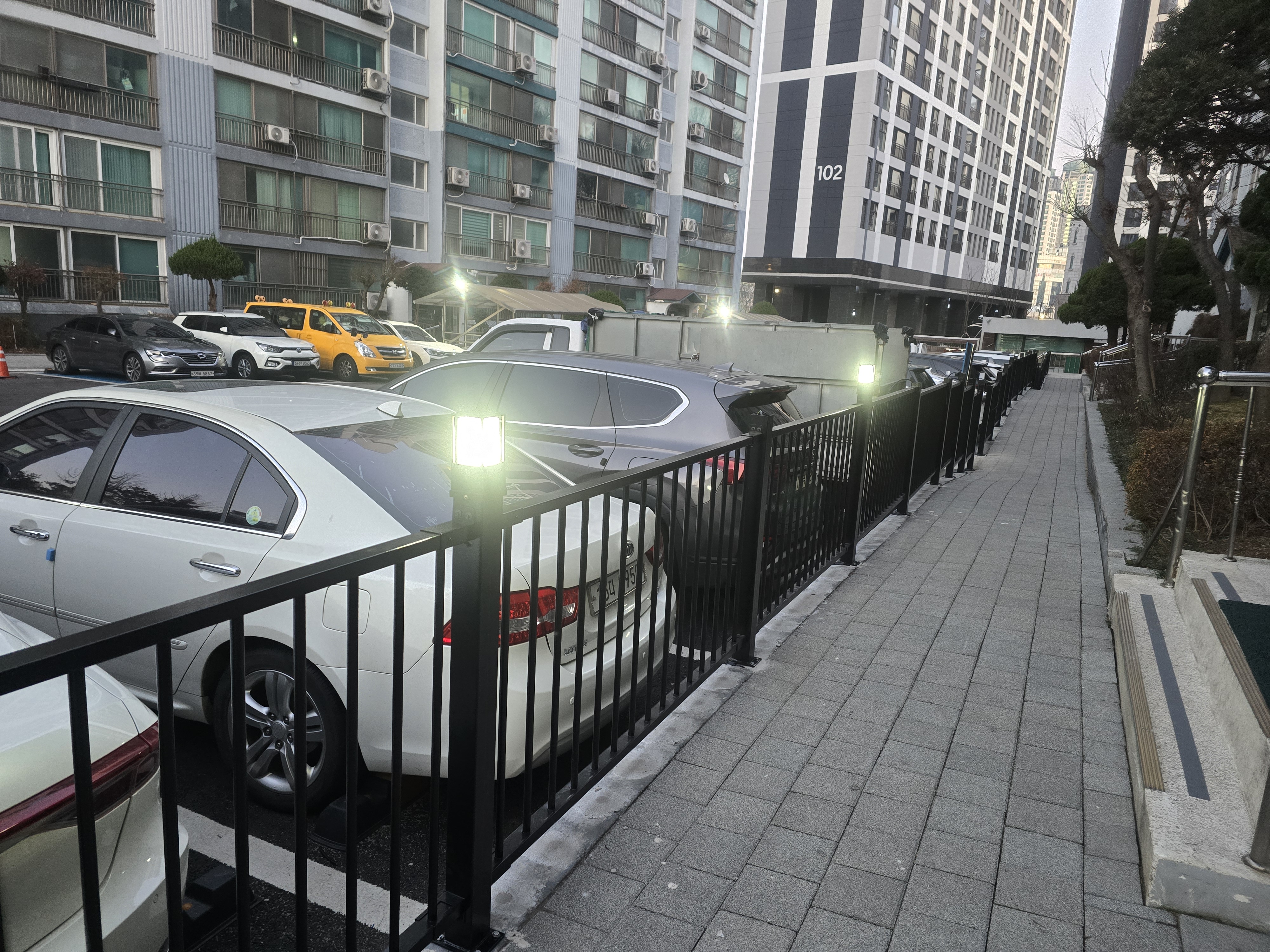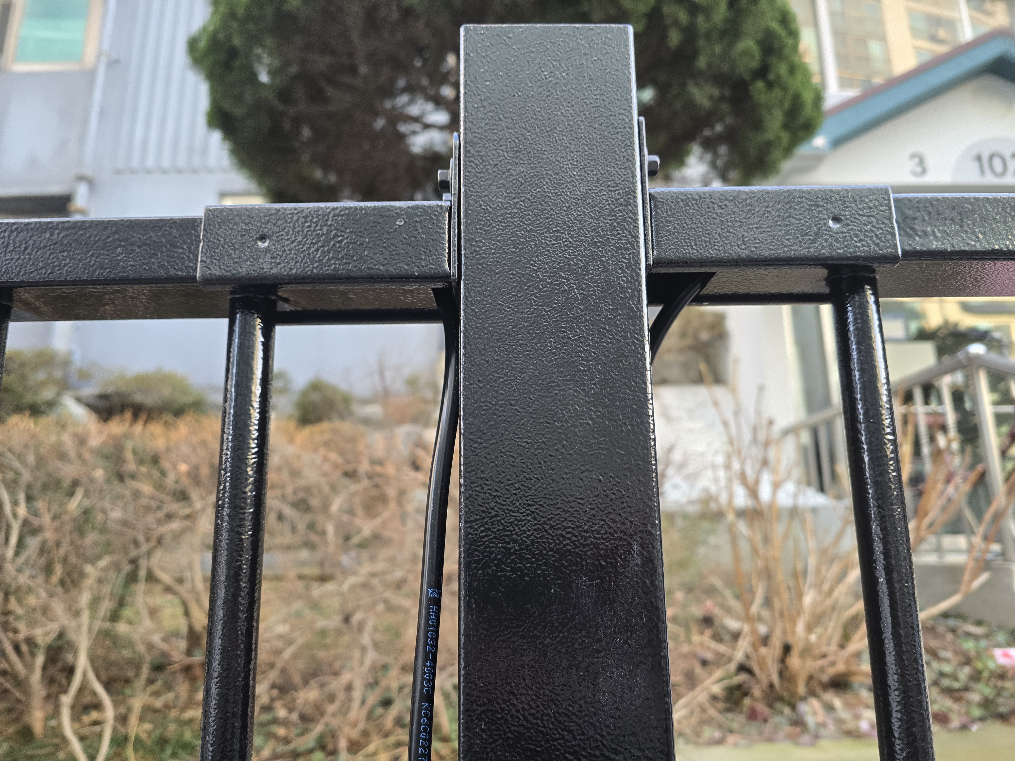 색상은 블랙 계열로 선택되었는데, 단순한 도색이 아닌 색이 쉽게 바래지 않는 마감 방식을 적용한 제품으로 진행했어요. 야외에 설치되는 구조물은 자외선, 비·눈, 미세먼지 등의 영향을 지속적으로 받기 때문에 색상 유지력은 매우 중요한 요소예요. 블랙 톤은 세련된 이미지를 주는 동시에, 주변 건물 외관과도 잘 어울려 전체적인 단지 분위기를 한층 정돈된 느낌으로 만들어줘요.