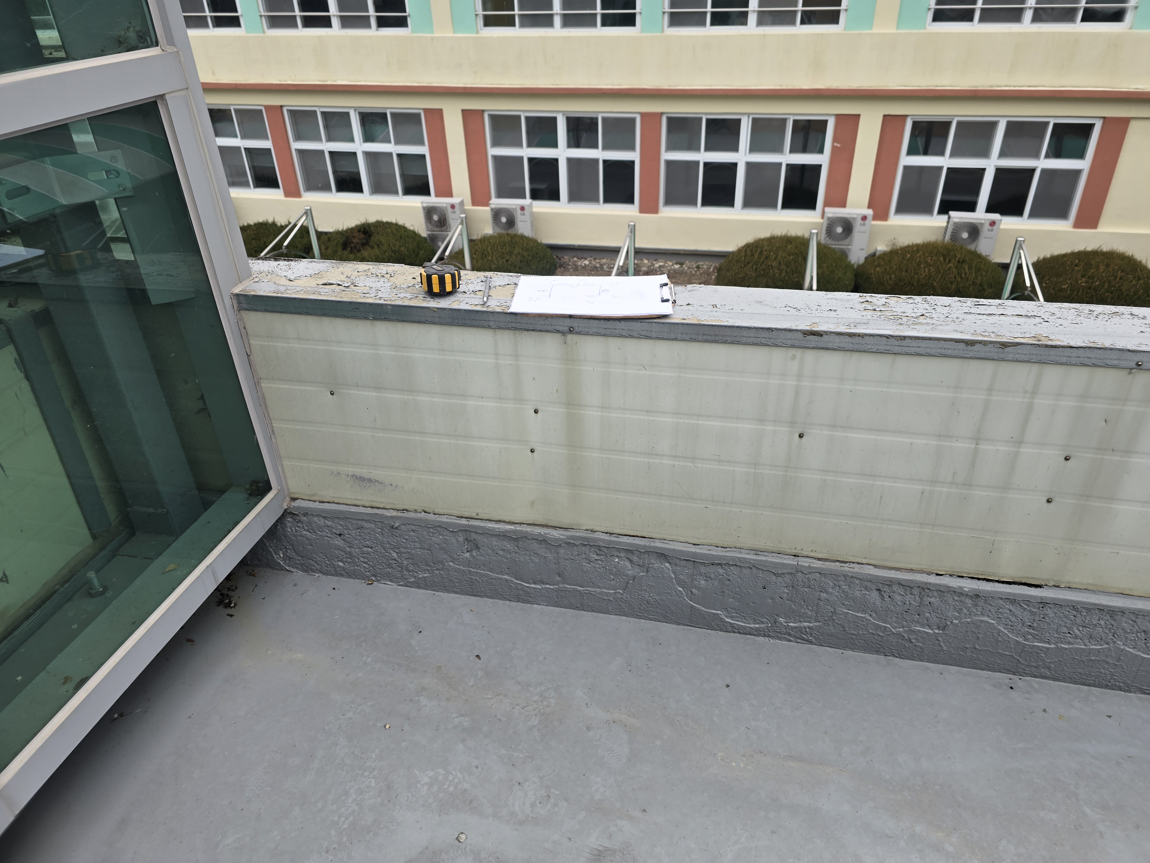 시공이 완료된 후 바닥 기준 높이는 약 H:1200~1300 정도로 나왔습니다. 높이가 구간마다 조금씩 다른 이유는 옥상 바닥 자체에 구배가 잡혀 있기 때문이에요. 물이 자연스럽게 배수되도록 경사가 형성된 구조라 동일한 수치를 유지하는 것이 오히려 비현실적입니다. 중요한 점은 전 구간이 건축법 기준인 H:1200 이상을 충분히 넘겼다는 점이고, 실제로 기대거나 손을 얹었을 때 흔들림 없이 안정적으로 지지된다는 점입니다.