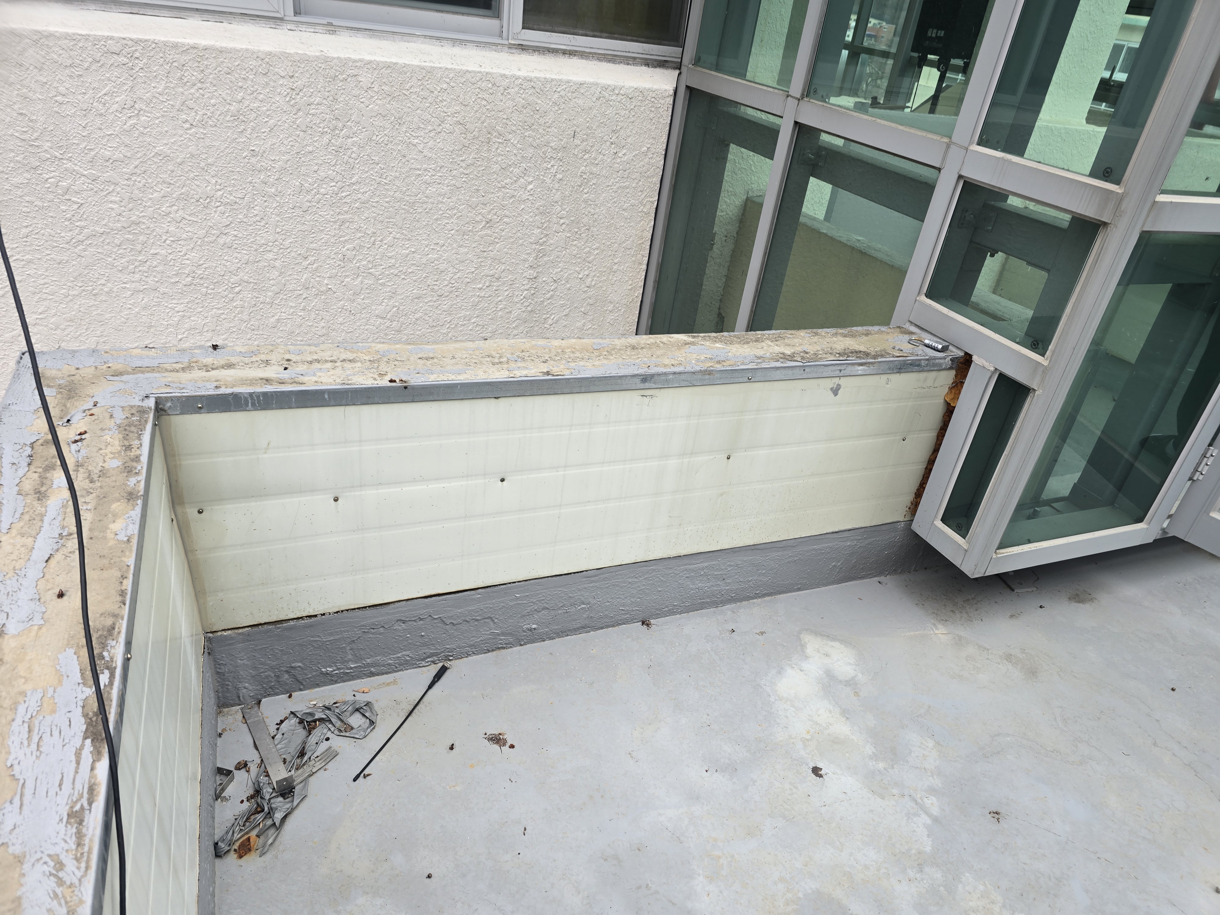 문제는 구조적인 조건이었습니다. 바닥에서 약 H:200 정도는 콘크리트 골조였지만, 그 위 구간은 샌드위치 판넬로 마감되어 있었고 상부는 갈바 처리로 마무리된 상태였어요. 이 구조에서는 단순하게 바닥 고정 방식만으로 시공을 진행할 경우 강성 확보가 어렵고, 장기적으로 흔들림이 발생할 가능성이 높습니다. 소비자 입장에서 가장 궁금해하는 부분도 바로 이런 지점이에요. “겉보기에는 멀쩡한데 왜 방법을 바꿔야 하나요?”라는 질문을 자주 받습니다.